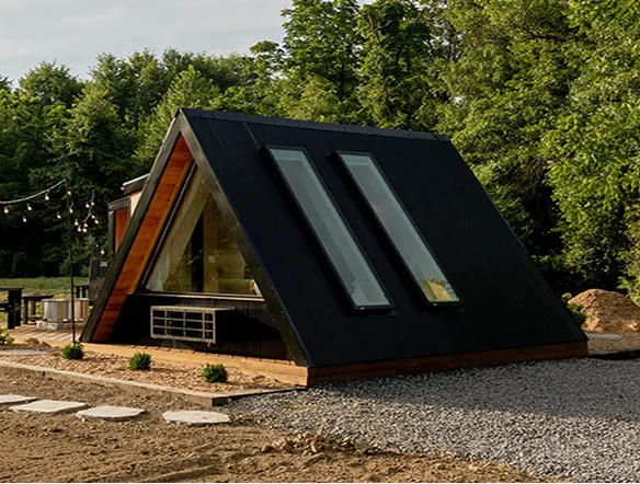 A modern A-frame styling, top-shelf amenities, and an optional sauna room with laundry. Perfect for glamping and wellness retreats.